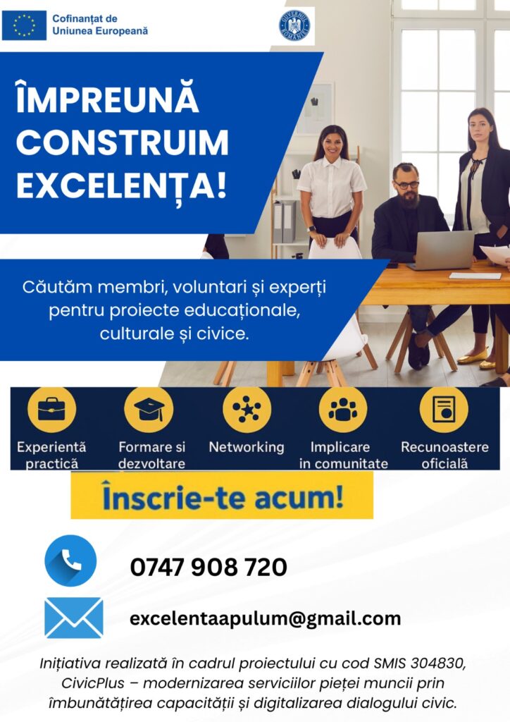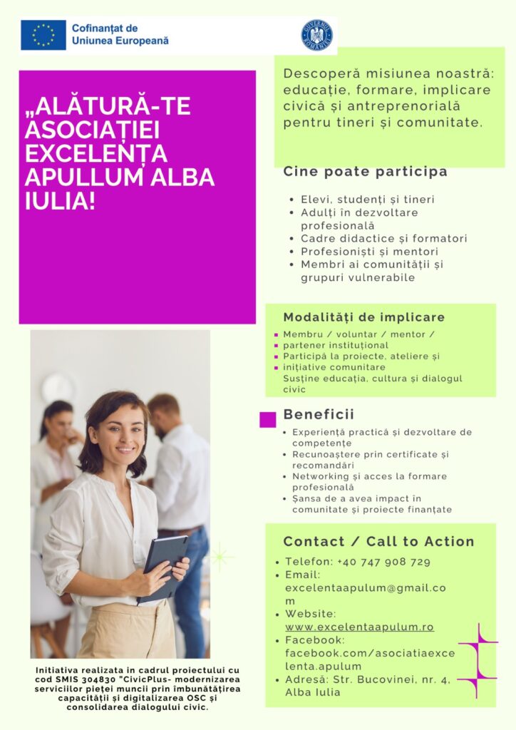 Asociația „Excelența Apulum” Alba Iulia este o persoană juridică de drept privat, cu scop nepatrimonial, înființată în anul 2014. Membrii fondatori au o bogată experiență în domeniul antreprenorial, oferind, prin intermediul angajaților și voluntarilor experți, servicii de consiliere și suport tinerilor care doresc să înființeze o afacere pe cont propriu.
