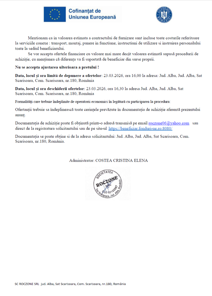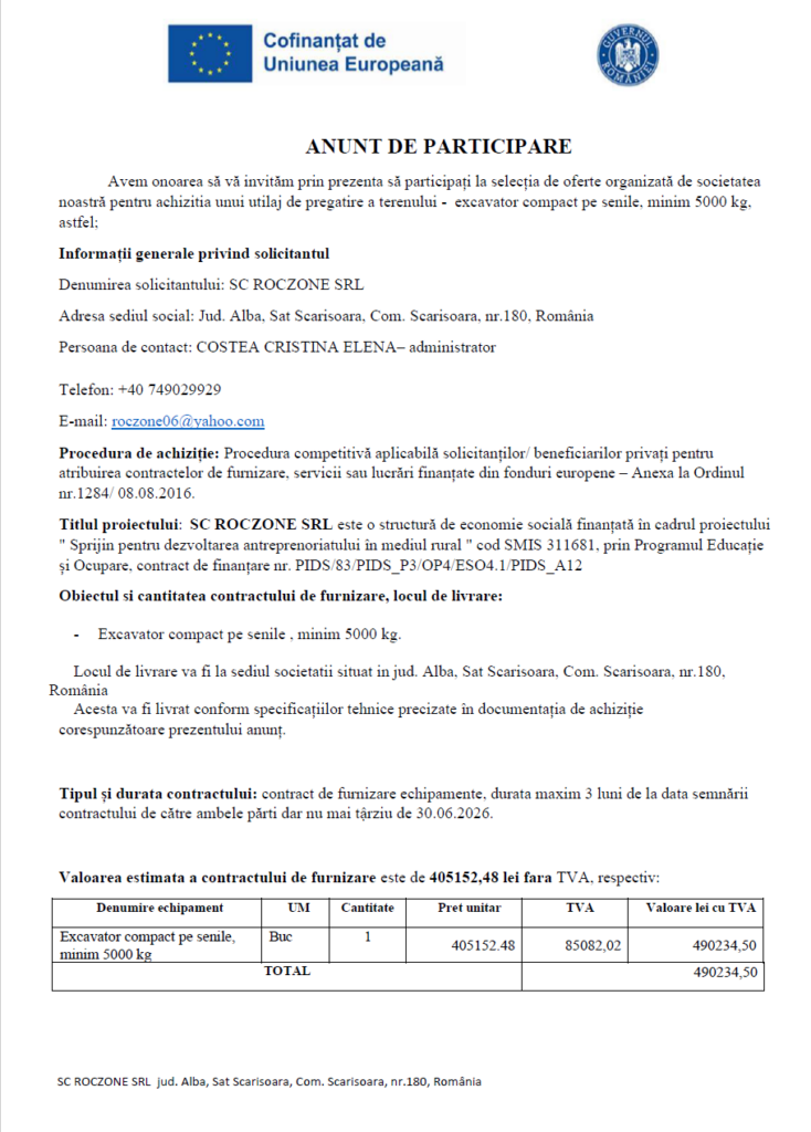 Descarcă Anunt si Documentația de atribuire pentru achiziția unui utilaj de pregatire a terenului – excavator compact pe senile, minim 5000 kg, publicat la data de 13.03.2026