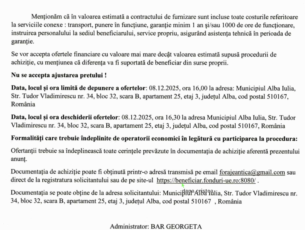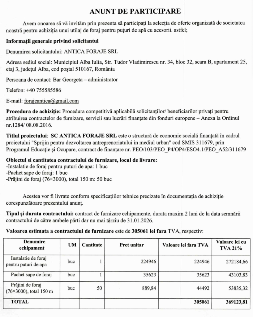 Descarcă Anunt si Documentația de atribuire pentru achiziția unui utilaj de foraj pentru puțuri de apă cu accesorii SC ANTICA FORAJE SRL, publicat la data de 27.11.2025 Anterior Articol Lansare proiect PEO 336457 "Transformare Digitală 360 de grade"